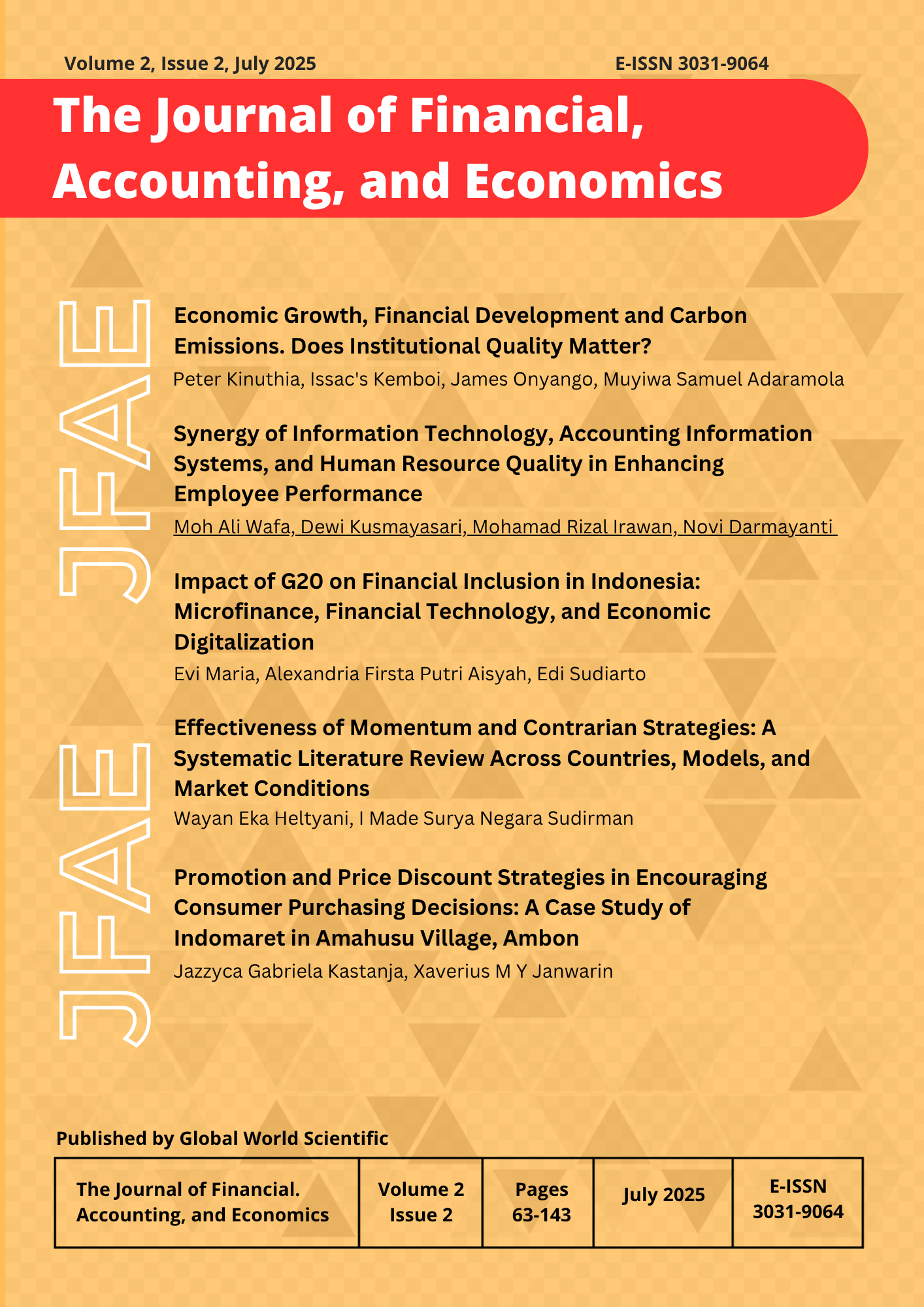 The Journal of Financial, Accounting and Economics (JFAE) is a scientific journal published by the Global World Scientific which aims to publish articles of empirical and theoretical studies in the field of Accounting, Finance, and Economics. Editors accept articles in English or Bahasa and were not delivered or published in another journal. Determination of the article that appeared determined by expert editors review results through double blind review process. JFAE focuses related on various themes, topics and aspects financial, Accounting, and Economics, including (but not limited) to the following topics: Financial Management, Behavioral Finance, Sharia Banking, Conventional Banking, Capital Market, Accounting, Behavioral Accounting, Economics Development, and Behavioral Economics.